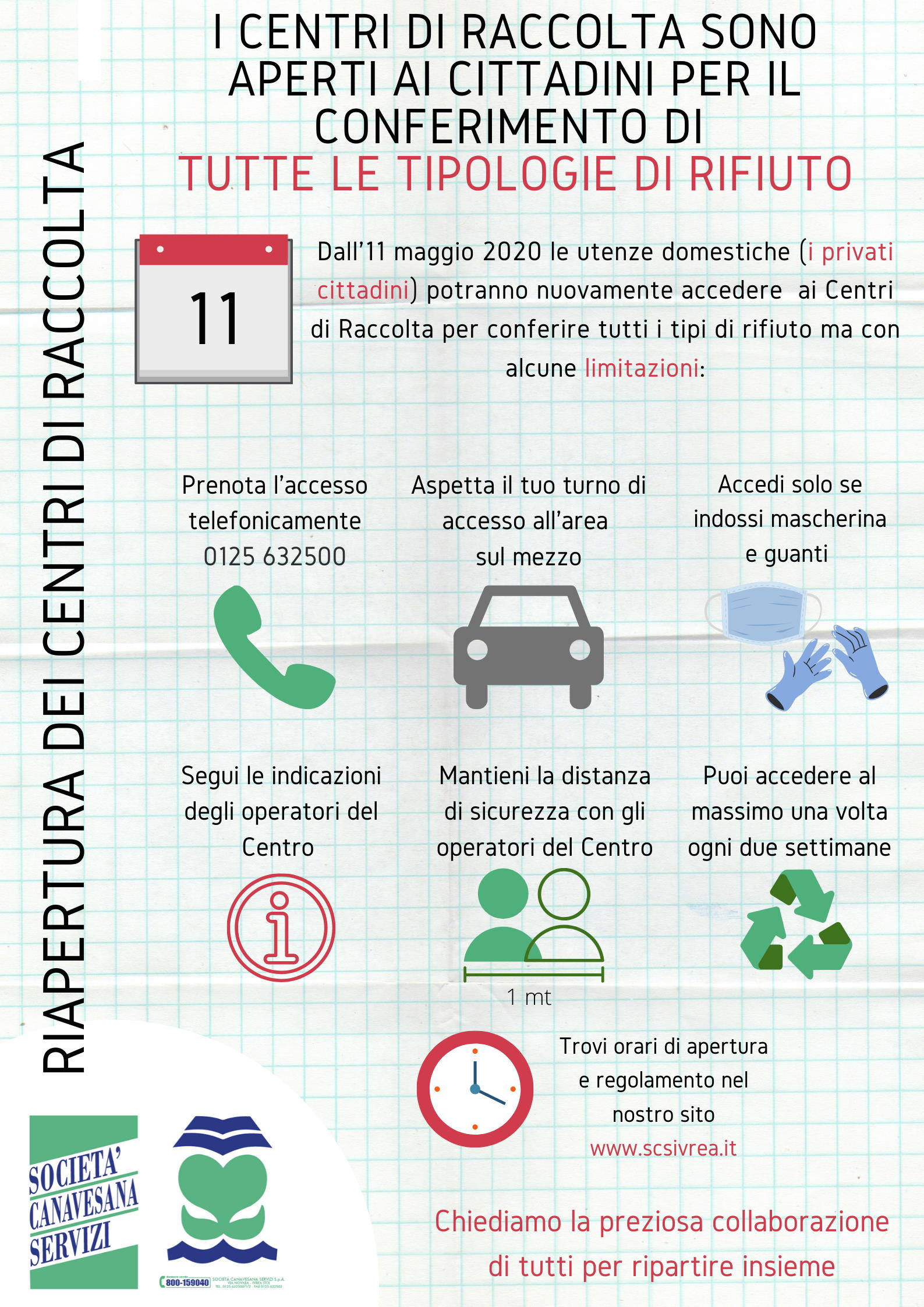A partire da lunedì 11/05/2020 riaprono completamente tutti i Centri di Raccolta S.C.S. per tutte le tipologie di rifiuto sia per i privati cittadini che per le utenze non domestiche (attività commerciali, industriali, professionali e produttive in genere).