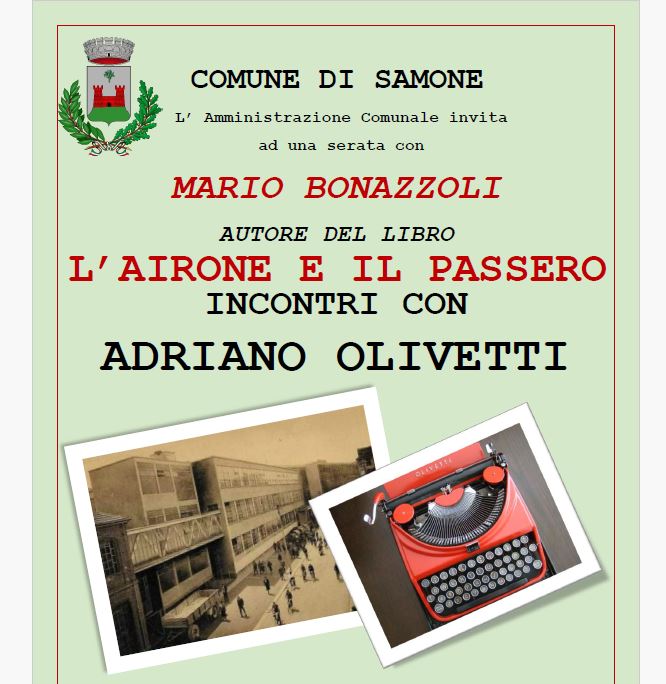 L'Amministrazione Comunale invita alla presentazione del libro "L'AIRONE E IL PASSERO INCONTRI CON ADRIANO OLIVETTI" dell' autore Mario Bonazzoli.