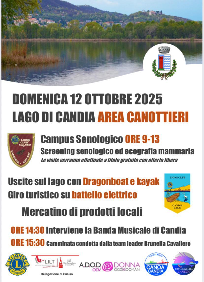 - DOMENICA 12 OTTOBRE presso il Lago Di CANDIA Area Canottieri: Campus senologico dalle 9.00 alle 13.00 (Screening senologico ed ecografia mammaria) ed inoltre, uscite sul lago e mercatino di prodotti locali.
