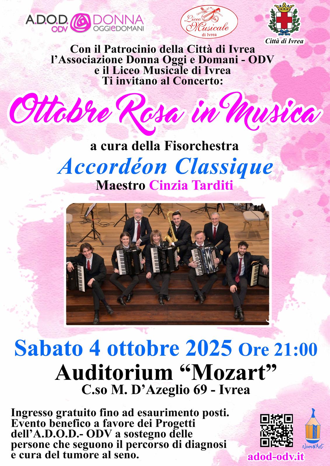 - SABATO 4 OTTOBRE a IVREA ore 21.00 presso Auditorium "Mozart" C.so M. D'Azeglio, 69: Concerto "Ottobre Rosa in Musica" a cura della Fisorchestra Accordéon Classique, Maestro Cinzia Tarditi