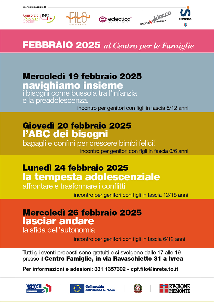 Comunichiamo ai cittadini che al Centro per le Famiglie F.I.L.O. di Ivrea prendono avvio nuovi incontri rivolti a genitori con figli in diverse fasce d'età: 0-6 anni, 6-12 anni; 12-18 anni.