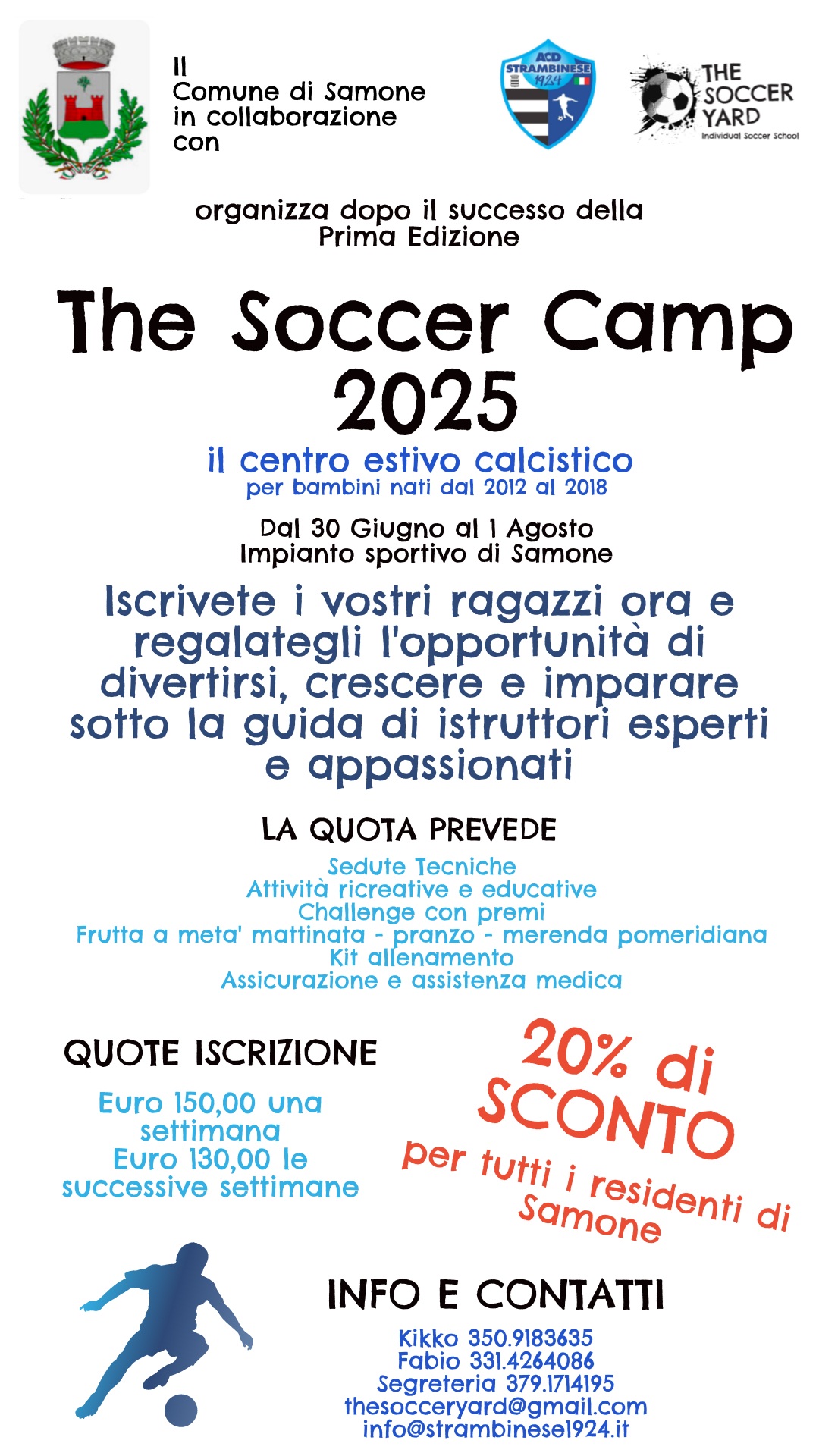 Il Comune di Samone in collaborazione con ACD Strambinese 1924 organizza il Centro estivo calcistico "The Soccer Camp 2025" per bambini nati dal 2012 al 2018!